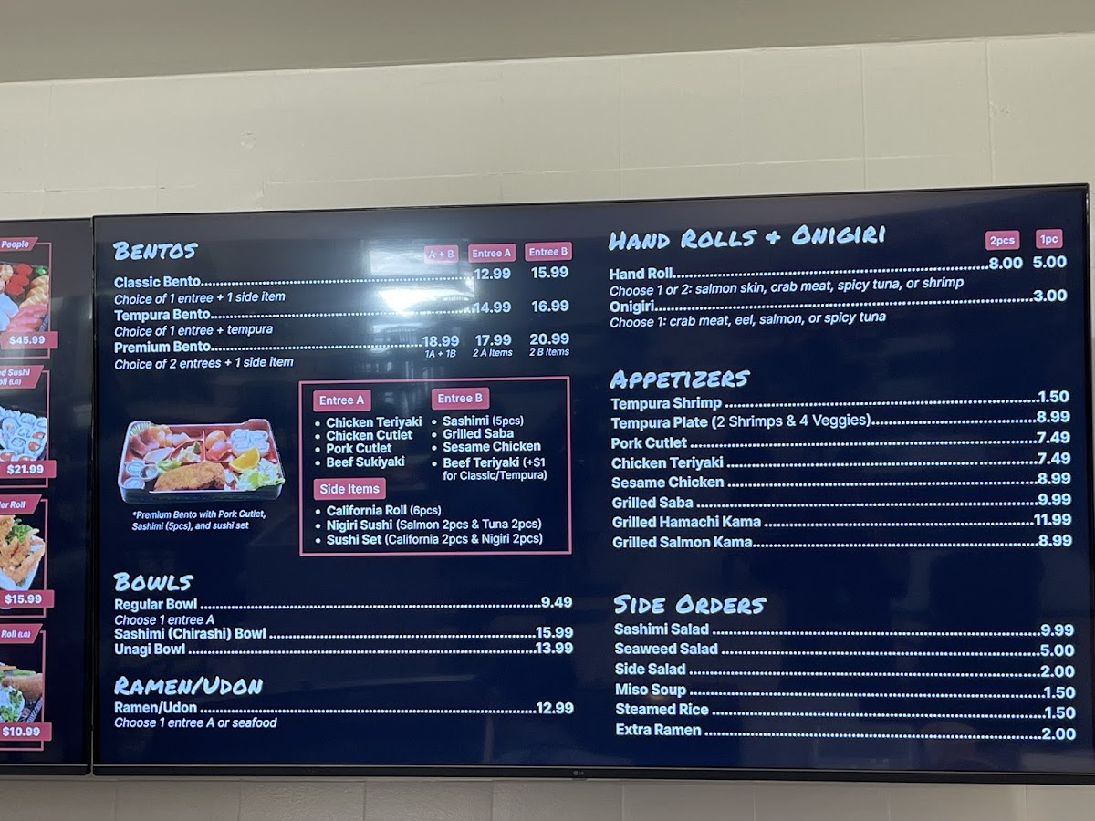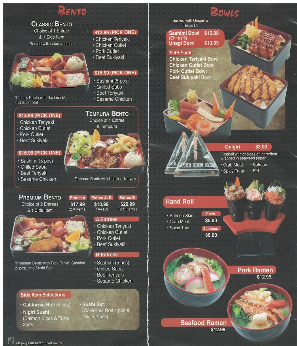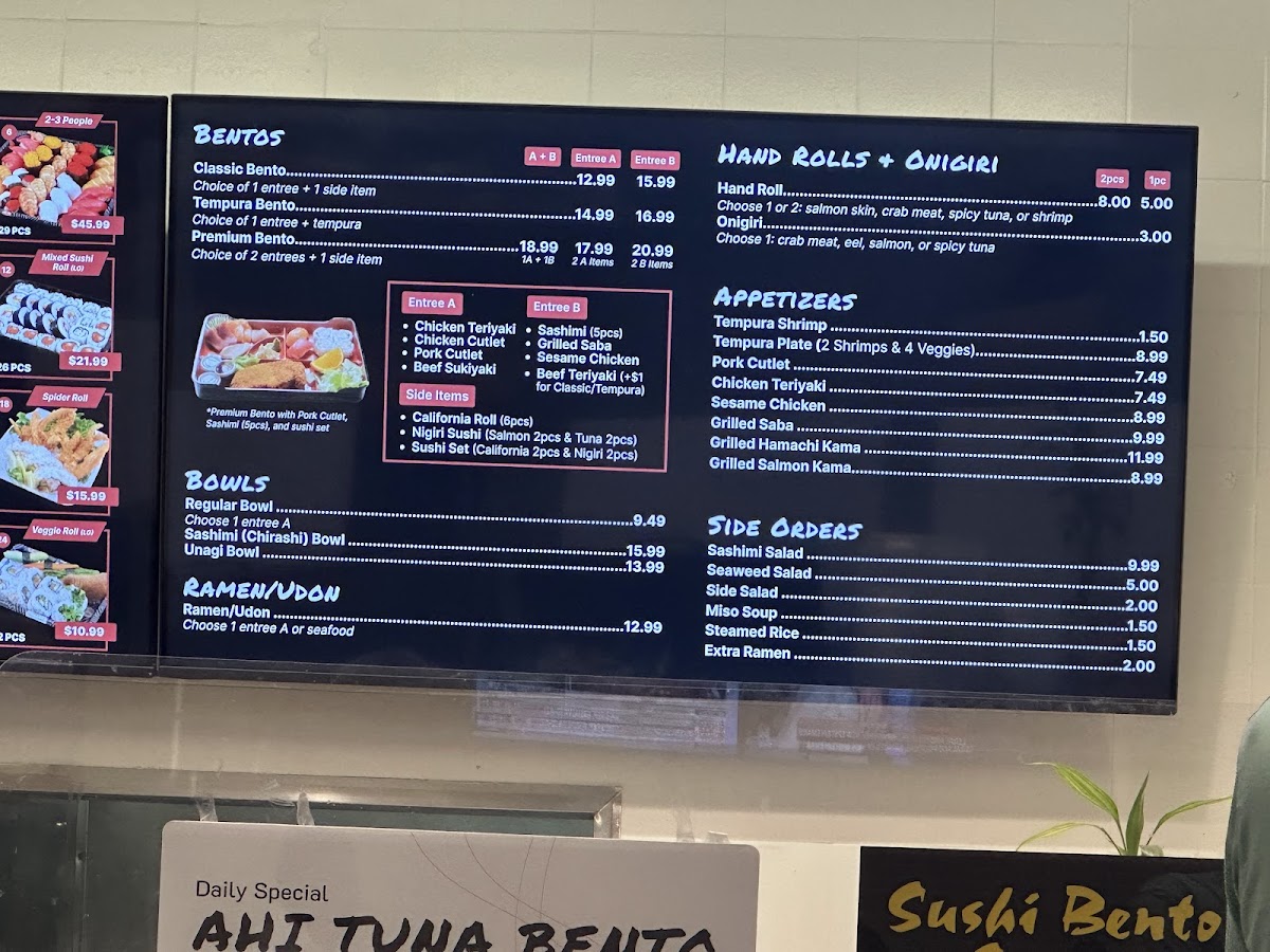 - Bento Boxes: These include Classic Bento, Tempura Bento, Premium Bento, and Chicken Cutlet Bento Box options, typically served with side dishes and rice components.