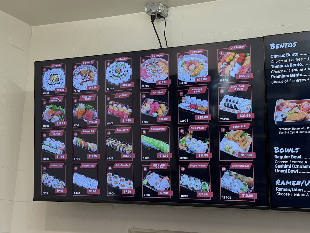 - Bowls and Noodles: Options include Teri Bowl, Regular Bowl, Unagi Bowl, as well as ramen and udon noodle dishes.
