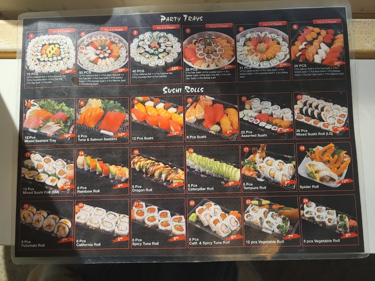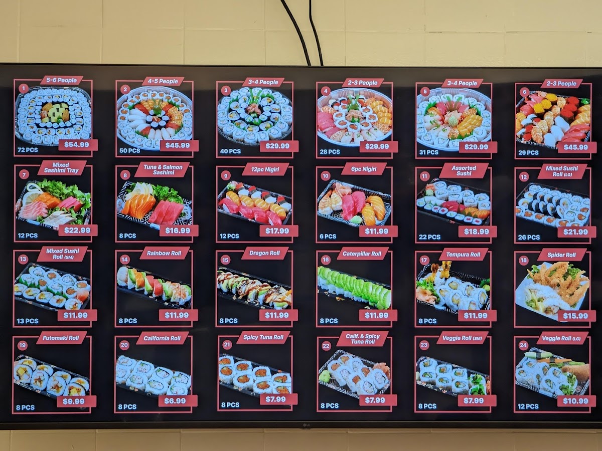 - Other Items: Additional offerings include hand rolls, onigiri, sliced beef, and mixed sushi and sashimi trays in various piece counts.